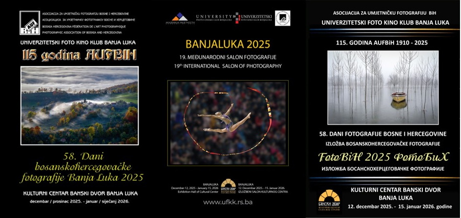 Pozivamo vas da prosustvujete otvaranje 19. međunarodnog salona fotografije Banja Luka 2025 i izložbe bosasnkohercegovačke fotografije FotoBiH Banja Luka 2025. Izložbe su spostavljene u izložbenom salonu Kulturnog centra Banski Dvor, a otvaranje je u petak 12. decembra 2025. godine u 19,00 časova. Tom prilikom dodijelit ćemo diplome najativnjim autorima i klubovima kao i dodijeliti diplome za umjetnička zvanja za 2025. godinu.