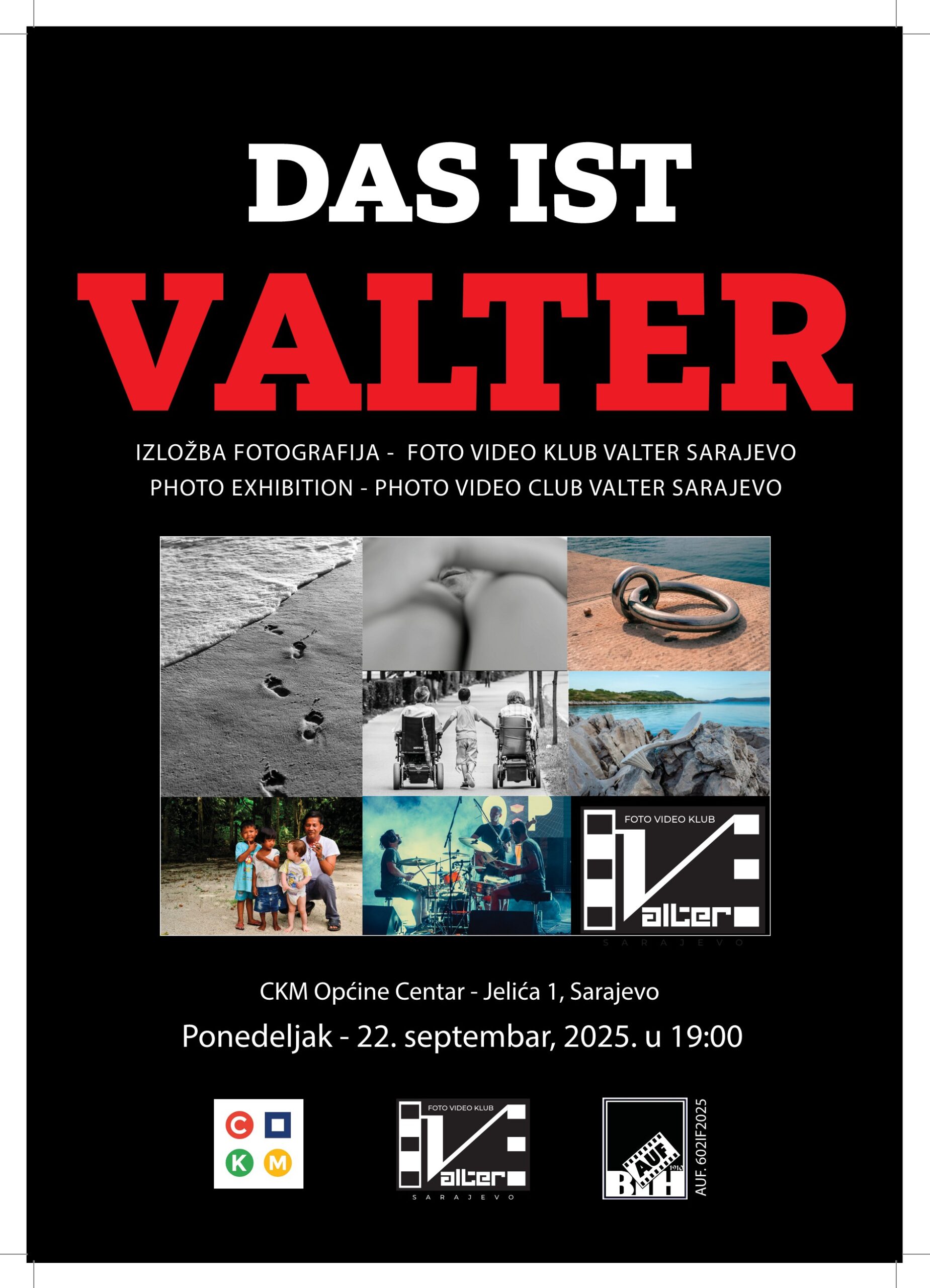 Drugi dio klupske izložbe Foto video kluba Valter Sarajevo pod nazivom “Da ist Valter 2” postavljen je u Centru za kulturu mladih opštine Centar Sarajevo, a otvaranje izložbe je u ponedjeljak 22. septembra 2025. godine u 19,00 sati.