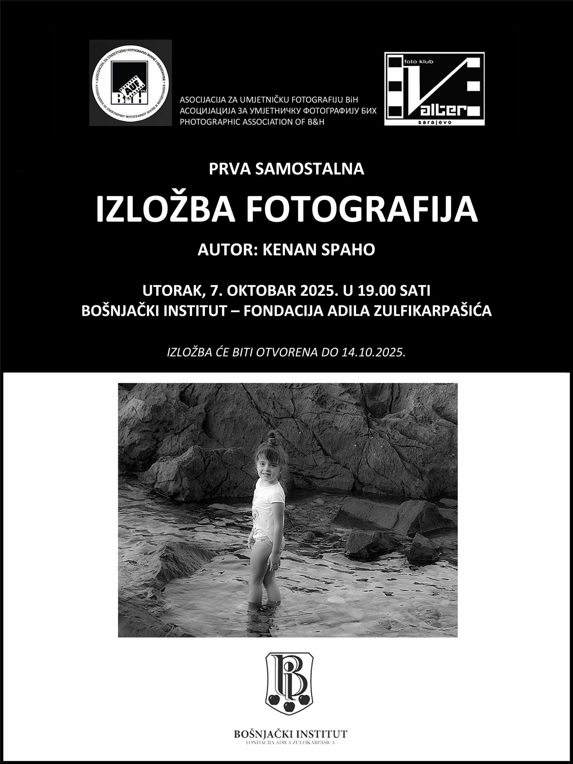 Pozivamo vas da prisustvujete otvaranju samostalne izložbe fotografija Kekana Spaho člana FVK Valter Sarajevo. Izložba je postavljena u Bošnjačkom instirutu Sarajevo, a otvaranje je u utorak 07. oktobra 2025. godine u 19,00 sati.