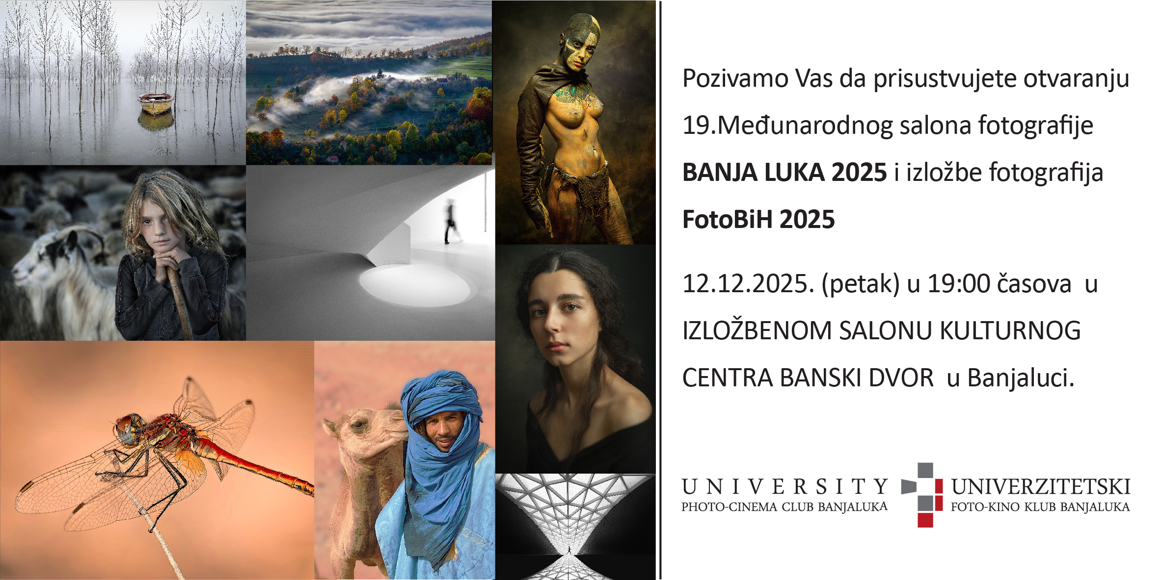 Pozivamo vas da prosustvujete otvaranje 19. međunarodnog salona fotografije Banja Luka 2025 i izložbe bosasnkohercegovačke fotografije FotoBiH Banja Luka 2025. Izložbe su spostavljene u izložbenom salonu Kulturnog centra Banski Dvor, a otvaranje je u petak 12. decembra 2025. godine u 19,00 časova. Tom prilikom dodijelit ćemo diplome najativnjim autorima i klubovima kao i dodijeliti diplome za umjetnička zvanja za 2025. godinu.