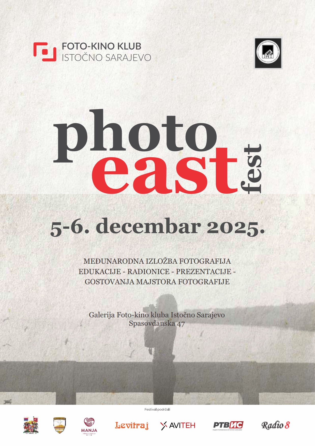 Pozivamo vas da prisustvujete programu održavanja Photo East festa u organizaciji Foto kino kluba Istočno Sarajevo. U okviru ove manifestaciji održat će se otvaranje međunarodne izložbe Photo East 2025 koja je postavljena u Galeriji FKK Istočno Sarajevo, a oitvaranje je u subotu 06. decembra 2025. godine u 18,00 časova.